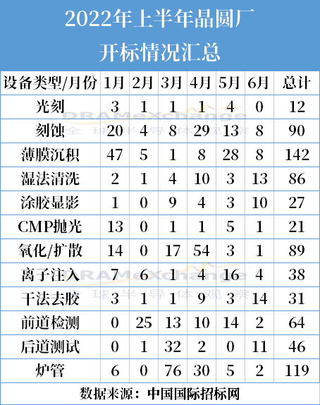 從開標數據看,2022 年上半年國內主要晶圓廠共開標765臺工藝設備,其中清洗設備86臺,數量排名第五。