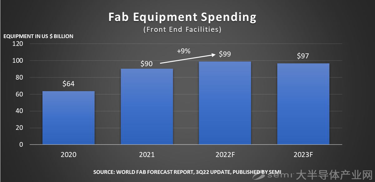 美國加州時間2022年9月27日,SEMI在其最新的季度《世界晶圓廠預測報告》(World Fab Forecast)中宣布,2022年全球晶圓廠設備支出預計將同比增長約9%,達到990億美元的歷史新高。