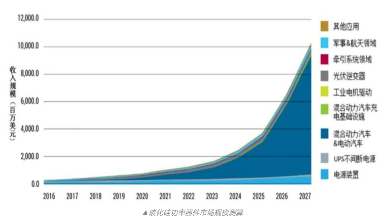 碳化硅具有寬的禁帶寬度、高擊穿電場、高熱傳導率和高電子飽和速率的物理性能,使其有耐高溫、耐高壓、高頻、大功率、抗輻射等優點,可降低下游產品能耗、減少終端體積,突破了硅基功率半導體器件在大電壓、高功率和高溫度方面的限制所導致的系統局限性。根據Wolfspeed官方提供的數據,相同規格的碳化硅基MOSFET尺寸僅為硅基MOSFET的十分之一。碳化硅在新能源汽車上的應用將在保證汽車的強度和安全性能的前提下大大減輕汽車的重量,有效提升電動車10%以上的續航里程,減少80%的電控系統體積。每輛新能源汽車使用的功率器件價值約700-1000美元。