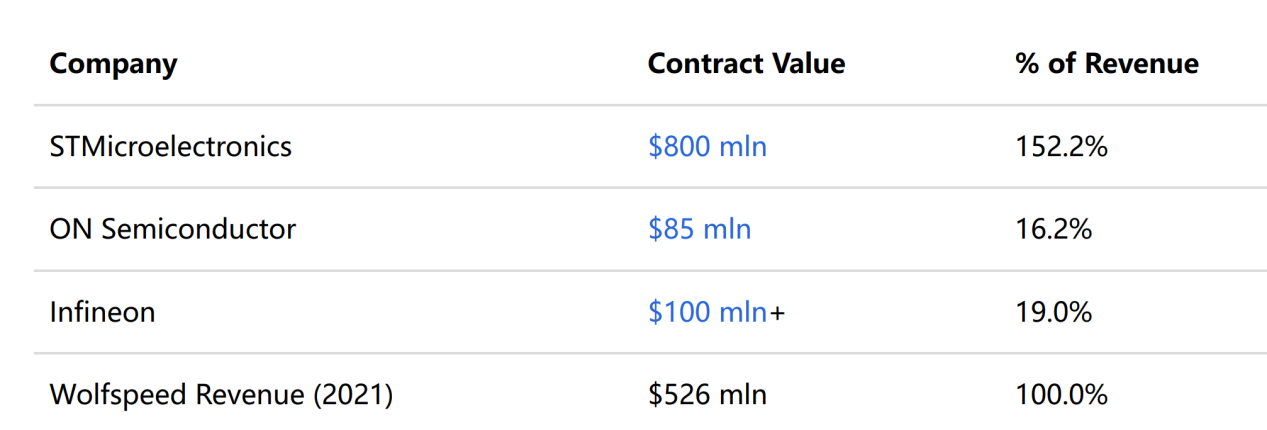 目前Wolfspeed是SiC晶圓市場的領導者,其市場份額為62%,其次是II-VI(IIVI)、SiCrystal和SK siltron。Wolfspeed與安森美、意法半導體和英飛凌簽訂了多份供貨協議,根據其年度報告,2021年意法半導體訂單占其收入的18%,雙方有超過8億美元的長期晶圓供應協議,如果僅算合同金額,意法半導體的這份合同(按照年均攤)是其年平均營收1.53倍,如下圖: