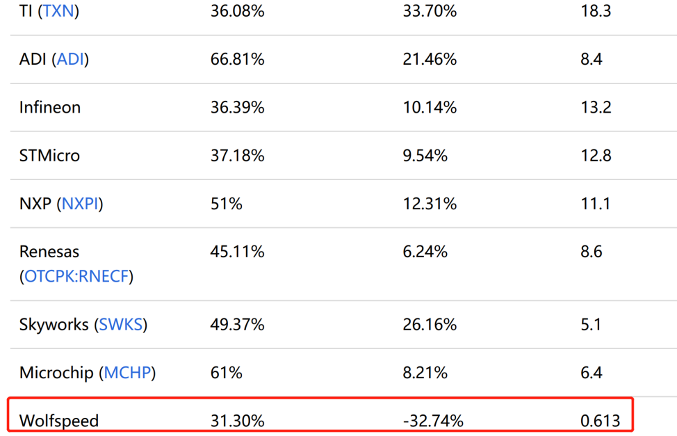 此外,IDM商業模式是領先碳化硅晶圓制造商通行的設備供應模式,在這些IDM中,Wolfspeed的毛利率和凈利率幾乎是最低的: